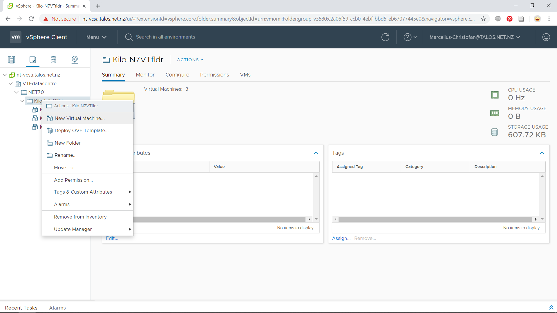 We will start by creating a new virtual machine (VM) to meet the requirements for ESXi. In the vSphere Client, go to VMs and Templates tab and right click your folder to and choose New Virtual Machine.