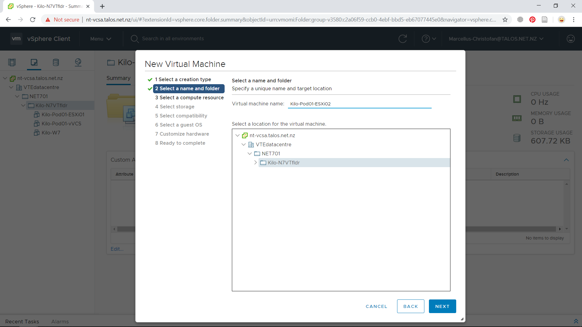 Next, we will choose Create a new virtual machine on the first step. After that, give the ESXi host VM an appropriate name (in my case is “Kilo-Pod01-ESXi01”).