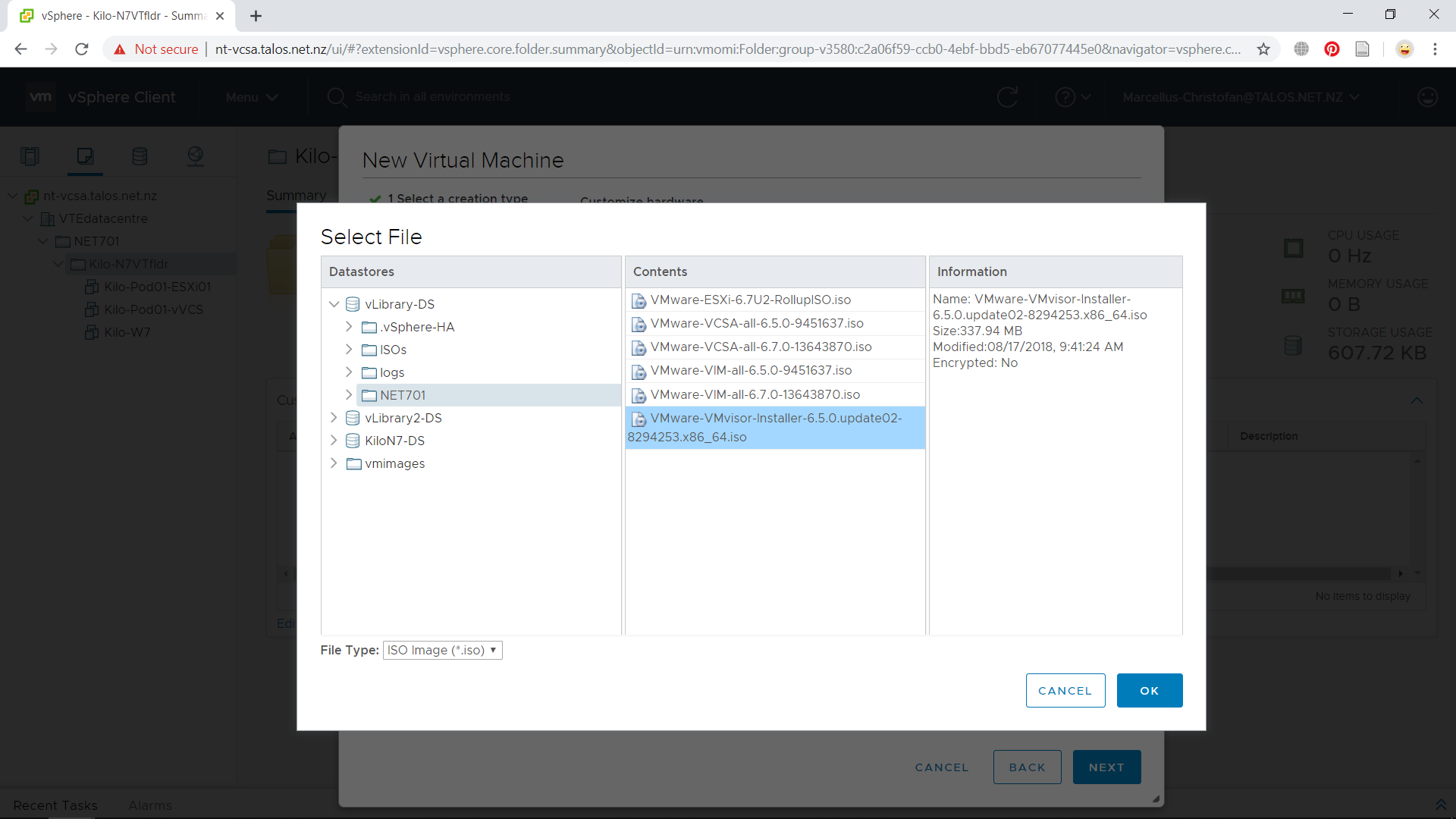 The hardware configuration is by default set for an ESXi host to run. We would want to mount the ESXi installer ISO in this VM. In the New CD/DVD Drive menu, choose Datastore ISO File then search for “VMWare-VMVisor-Installer-6.5.0.iso” or similar to this name. Press OK if you have selected it and put the check on Connect at power on checkbox. Press Next then Finish to complete the VM creation process.