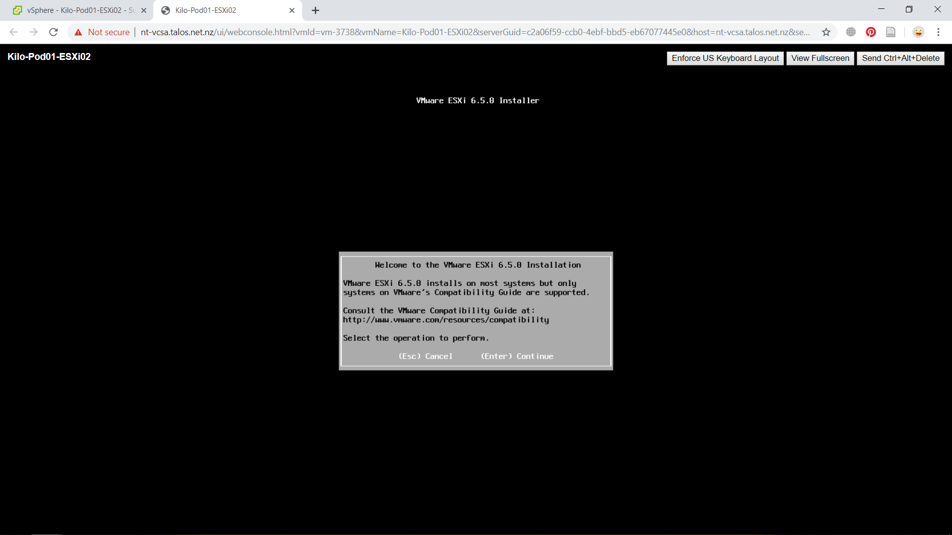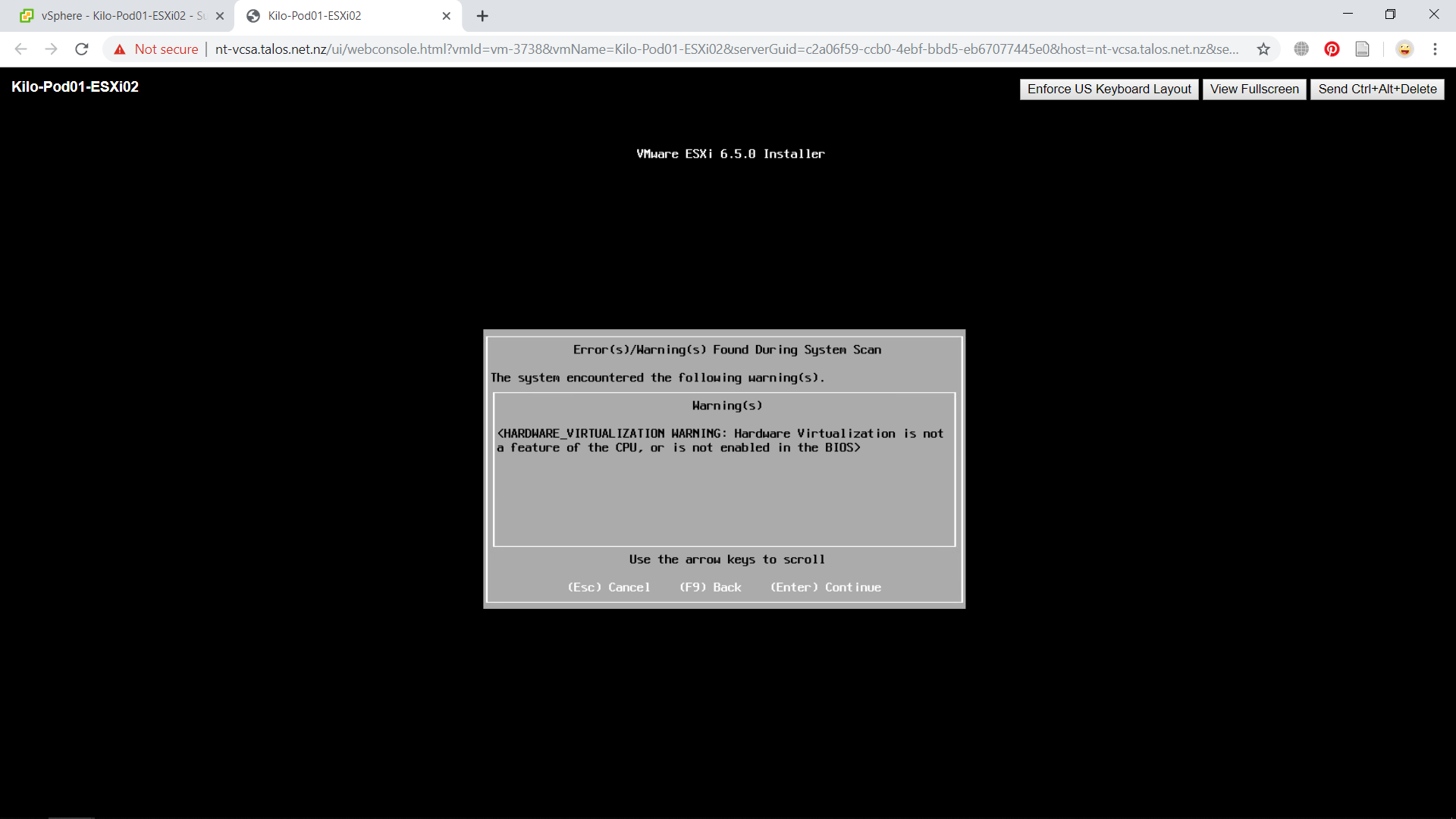 A hardware virtualization warning should appear and you would be recommended to ignore the warning and continue with the install by pressing Enter. This warning is caused as we are making a nested ESXi host which means it would essentially create a nested virtual environment.