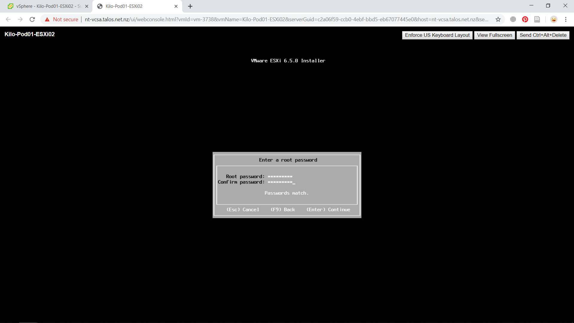 Select you preferred keyboard layout and press Enter to continue. In this part, register your password to access this ESXi machine. You will need to enter twice for the confirmation. Press Enter to continue to the next step.