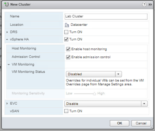 Start from you vSphere Web Client Hosts and Clusters tab. Right-click the Datacenter and select new Cluster. On the new cluster window, configure as shown on Figure 1. You have to turn on vSphere HA check box. Click OK.