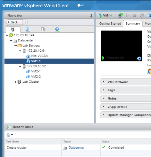 Check the Recent Tasks pane to see it’s creation progress and after it is finished you can see that it appears in the navigator pane.