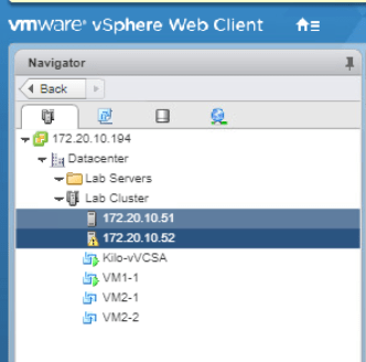 Expand all of the objects in Hosts and Clusters tab and move both of your ESXi host to the Lab Cluster by dragging it. Click Yes on the warning. Be aware that all of the resource pools will be collapsed and all objects will be seen as one level. Also I will be dragging the second ESXi host first as it will be the master host, this is done like so because we are going to manually turn off an ESXi function and the first ESXi holds the VCSA which will cause our management system when it turns off.