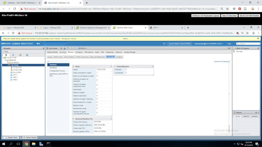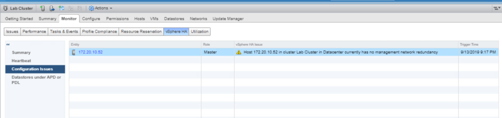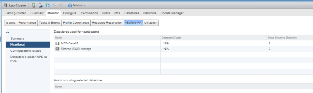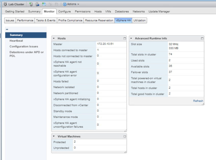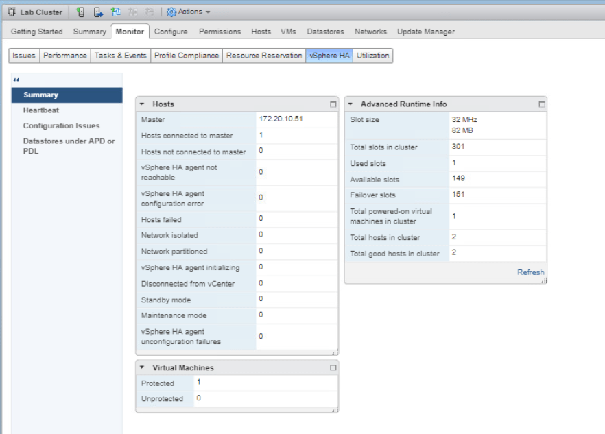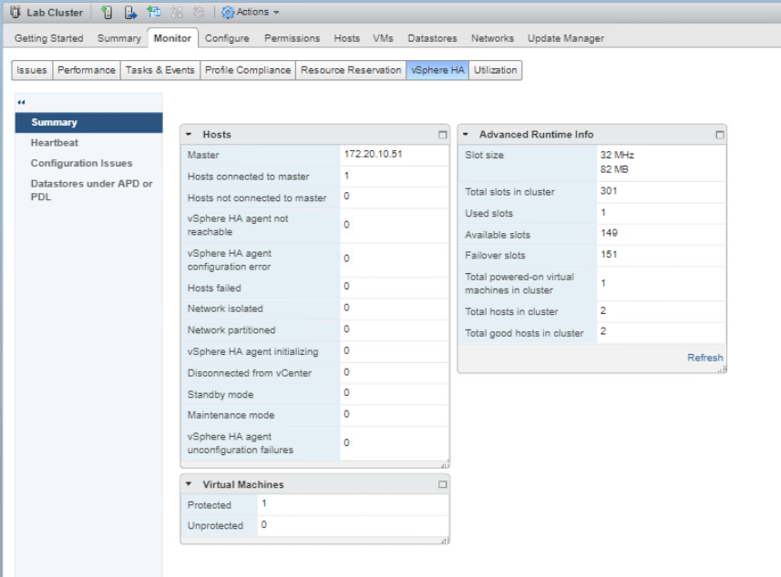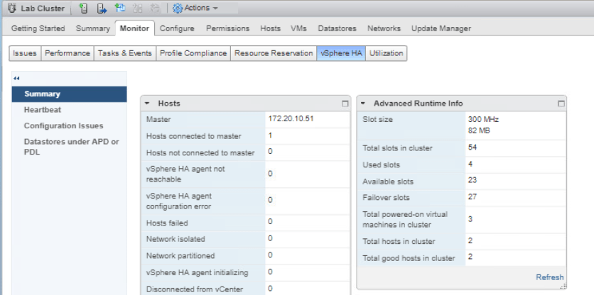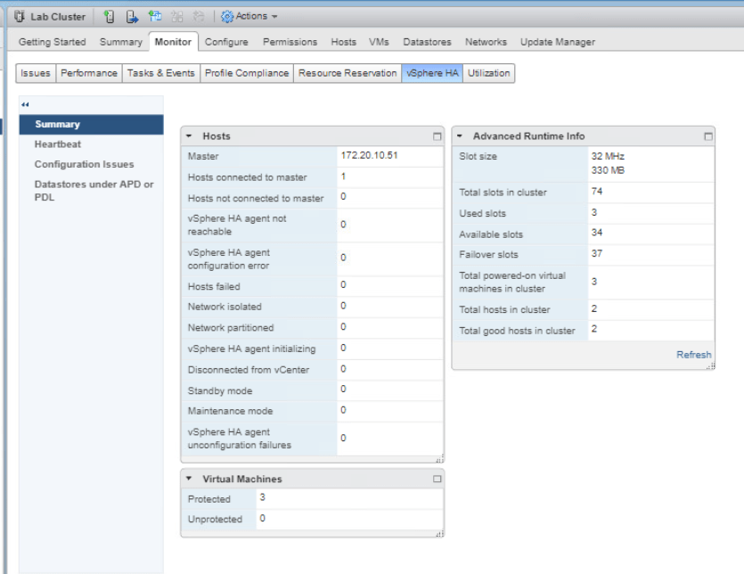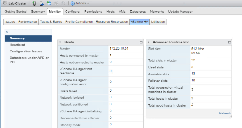 Select Lab Cluster and go to the Monitor tab in the middle pane. Click on vSphere HA tab then Summary to see information about the cluster.