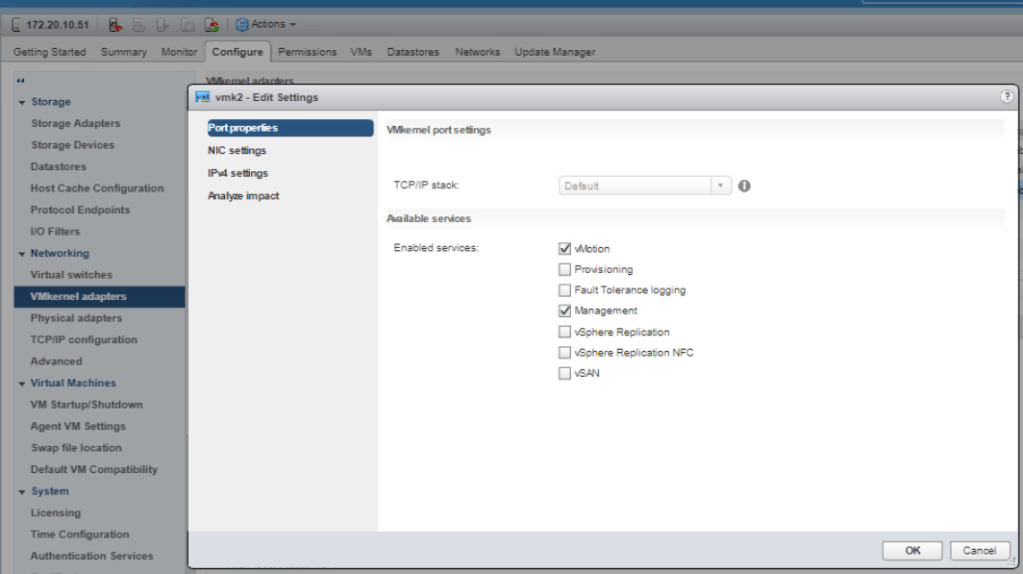 Now select your first ESXi host and go to the Configure tab. Select VMKernel adapters under Networking. Click on your vMotion VMKernel then click on Edit Settings icon. Make sure that on the Port properties page, vMotion and Management check box is checked. Click OK.