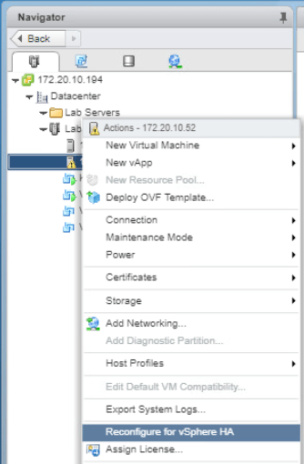 On the navigator pane, right click your first ESXi host and select Reconfigure for vSphere HA.