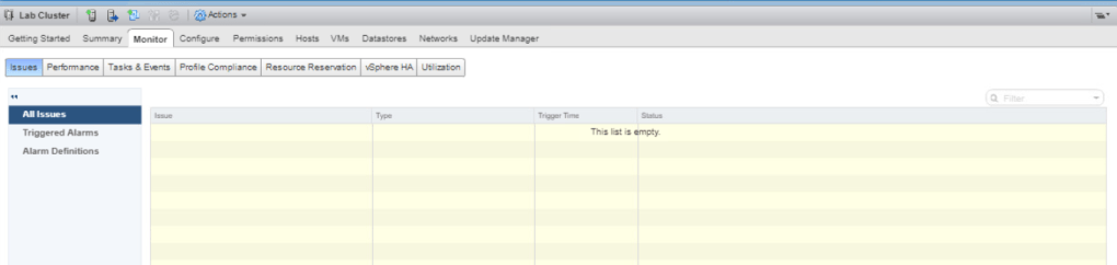 Repeat the above steps for the second ESXi host. After that, Go to the Monitor tab on Lab Cluster and click Issues then All Issues. Check if there are still any warnings or errors after the configurations. Ideally, it should be empty.