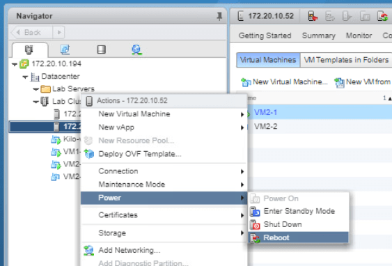 Now, we will try to reboot the master ESXi host to simulate the vSphere HA. Right-click the ESXi host and go to Power > Reboot. Click OK.