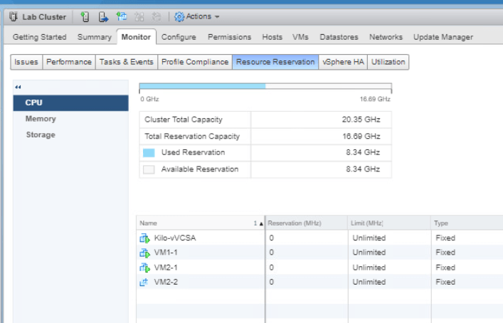 Go to the Hosts and Clusters tab and select Lab Cluster. Go to Monitor tab and choose Resource Reservation. Select CPU and it will display information about reservations CPU load. Verify that the reservation is not set on the VMs and it should be showing 0 (MHz).
