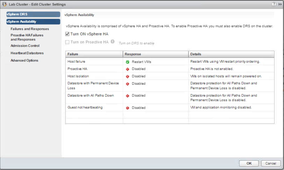 Go to Hosts and Clusters, right-click Lab Cluster and select Settings. In the middle pane, select vSphere Availability under Services and choose Edit.