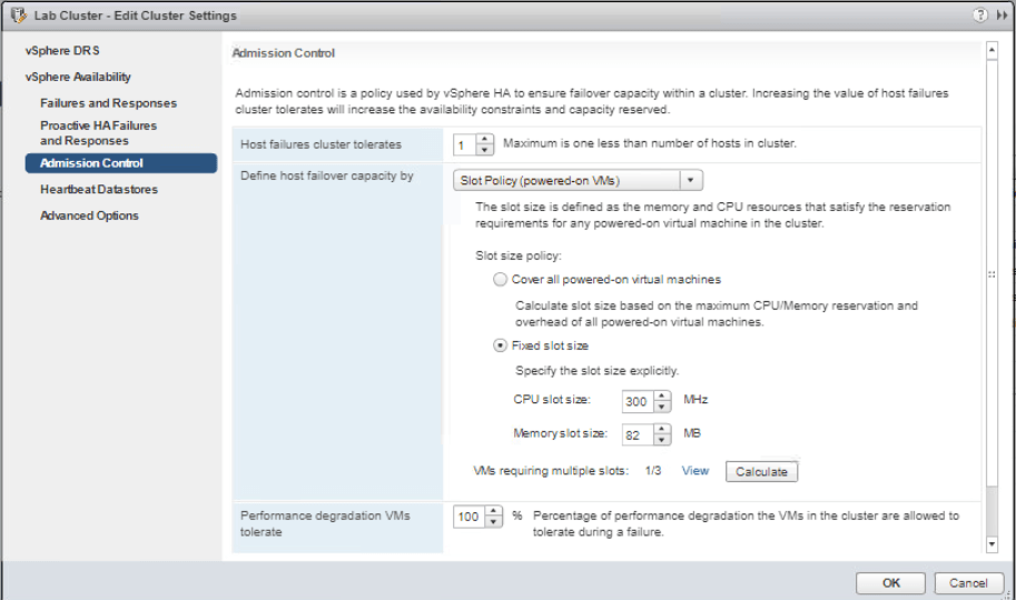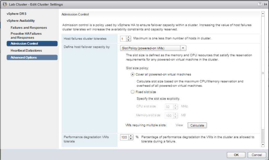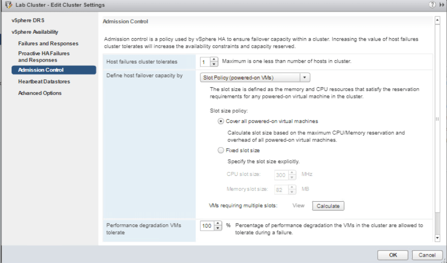 Now select Admission Control and choose Slot Policy (powered-on VMs) on Define host failover capacity by menu. Click OK.