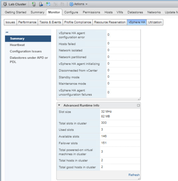 Now back to the Monitor tab of the Lab Cluster, select vSphere HA and click Summary. As you can see the Total slots in cluster is displayed as 301.