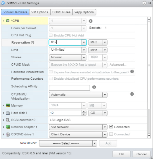 Next, select VMs and Templates tab and turn on one of the VM. Set the CPU Reservation of the VM by going to Edit Settings the expand CPU. Enter 512 (MHz) on the Reservation text box. Click OK.