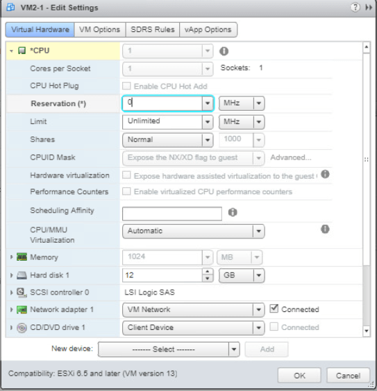 Also remove the CPU reservation for the VM by going to Edit Settings on the VM. Expand CPU and enter 0 (MHz) on the Reservation text box. Click OK.