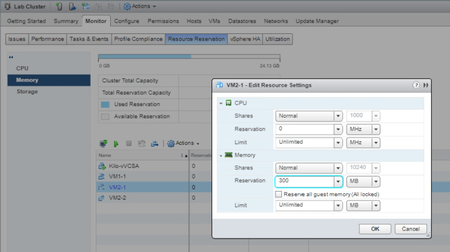 Now go to the Monitor tab and select Resource Reservation then Memory. Right-click on your VM2-1, select Edit Resource Settings. Expand Memory and fill 300 (MB) on Reservation text box and click OK. Repeat this action with another VM1-2.