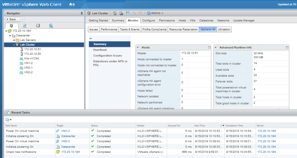 Now go to Lab Cluster Monitor tab. Choose the vSPhere HA tab and select Summary. See that the master has changed to the first ESXi host.