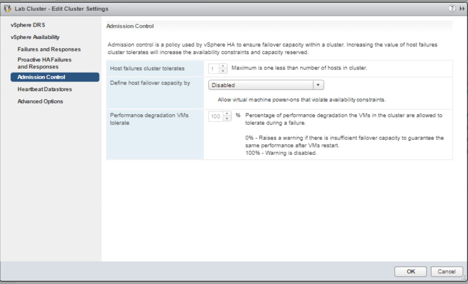 Lastly, disable the admission control that constraints the cluster failover capacity. Right-click Lab Cluster and select Settings. Select vSphere Availability and click Edit. Select Admission control on the left pane and on the Define host failover capacity by, choose Disabled then click OK.