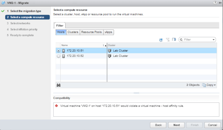 Now, try to migrate one of your VM2-#. Right-click one of your VM2-# and select Migrate. Select Change computer resource only and click Next. Then select the Lab Cluster and you will see that there is compatibility problem as there is a rule that has been set to prohibit this action. Click cancel.