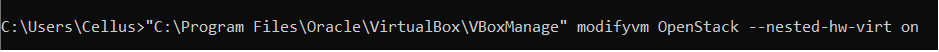 Next step is to turn on Nested VT-x/AMD-V which could be found in the VM Settings > System > Processor. Due to an Intel processor in my machine, it is grayed out and to turn it on, run the code below through command prompt. “OpenStack” in the command is according to the VM’s name that you have created.