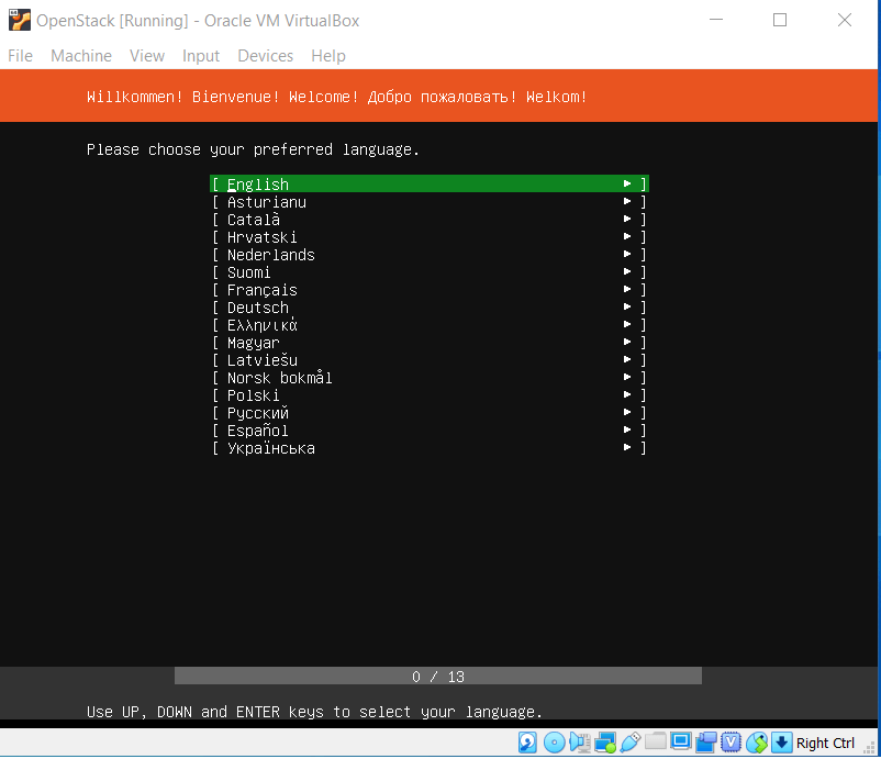 After running the VM, Ubuntu installation should start immediately with the first page in language configuration.