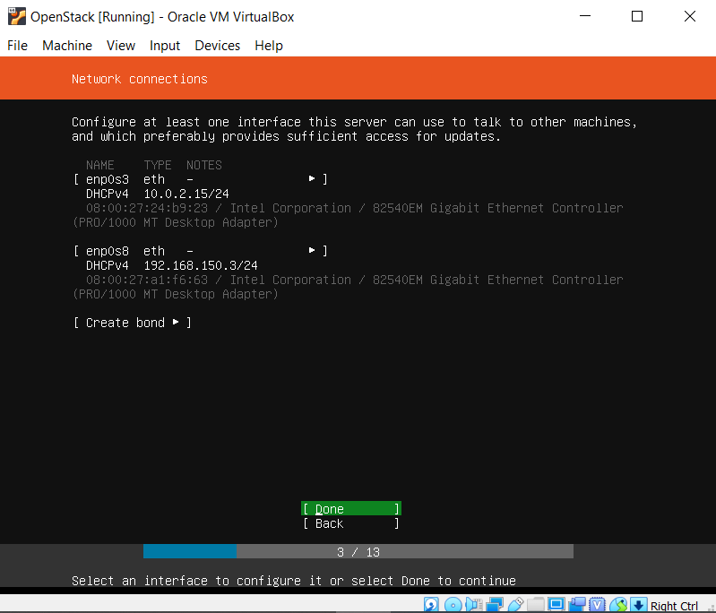 Follow the steps and leave the configurations as default. As you reach the network connections configuration, make sure that there are 2 network connected, the first would be the NAT network while the second one would be the Host-Only network adapter.