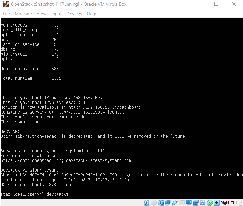For the Cloud Services course, we will be setting up OpenStack as the platform to run AWS. It will be done in our own virtual environment using VirtualBox. For the first lab, we will be installing OpenStack in VirtualBox.