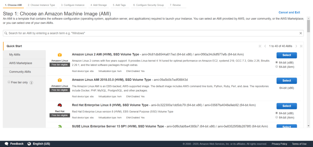 Next step is to choose an Amazon Machine Image (AMI). We will use the default one that AWS has provided which is Amazon Linux 2 AMI. Click Select.