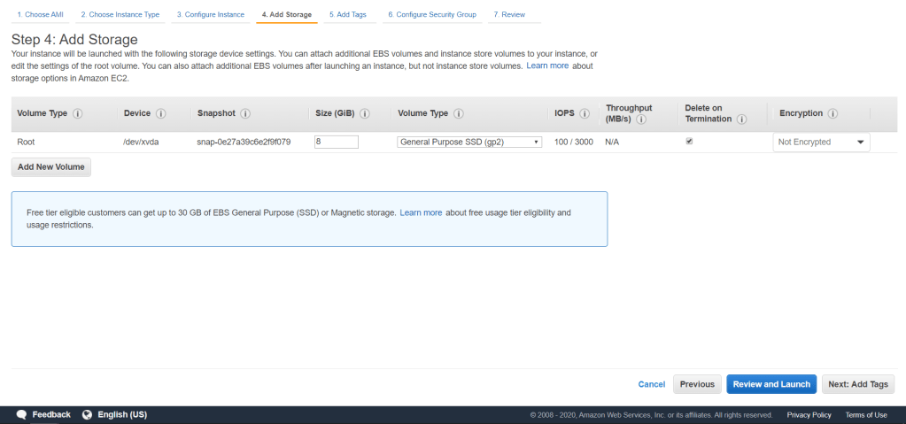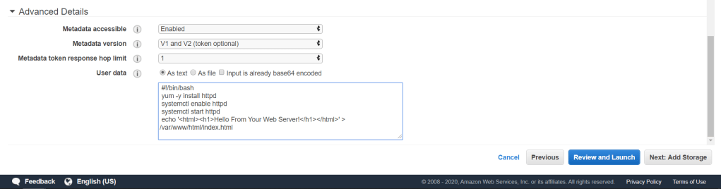 This code will run when the instance starts. The script consists of commands that install Apache web server (httpd), start web server on boot, activate web server and a simple html script inside. Click Next: Add Storage.