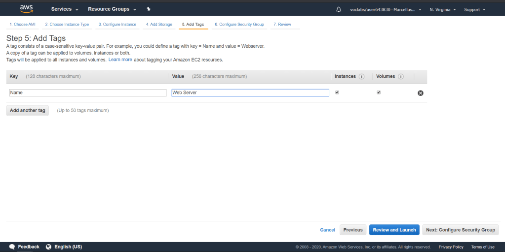 Add a tag with the Key = Name and Value = Web Server. Click Next: Configure Security Group.