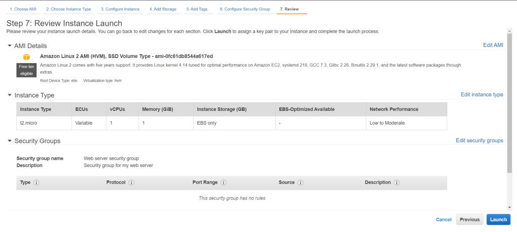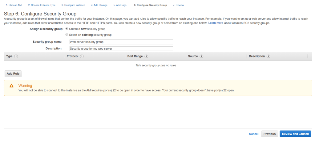 For the security groups, create a new one with the name and description like below. By default there should be one rule to allow an SSH connection. Remove the rule as it poses a risk and we will not be using SSH to connect to the web server. Click Review and Launch.