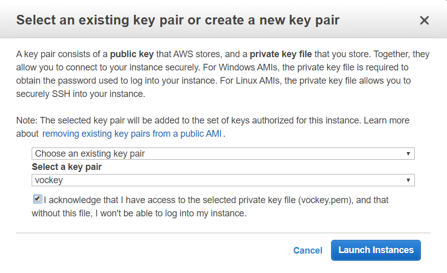 Before launching an instance, you would need to assign a key pair for the instance. You will then need to use the key pair to securely connect to the instance. In this lab, a key has been provided thus I selected an existing key pair. Check the acknowledgement terms and click Launch Instances.