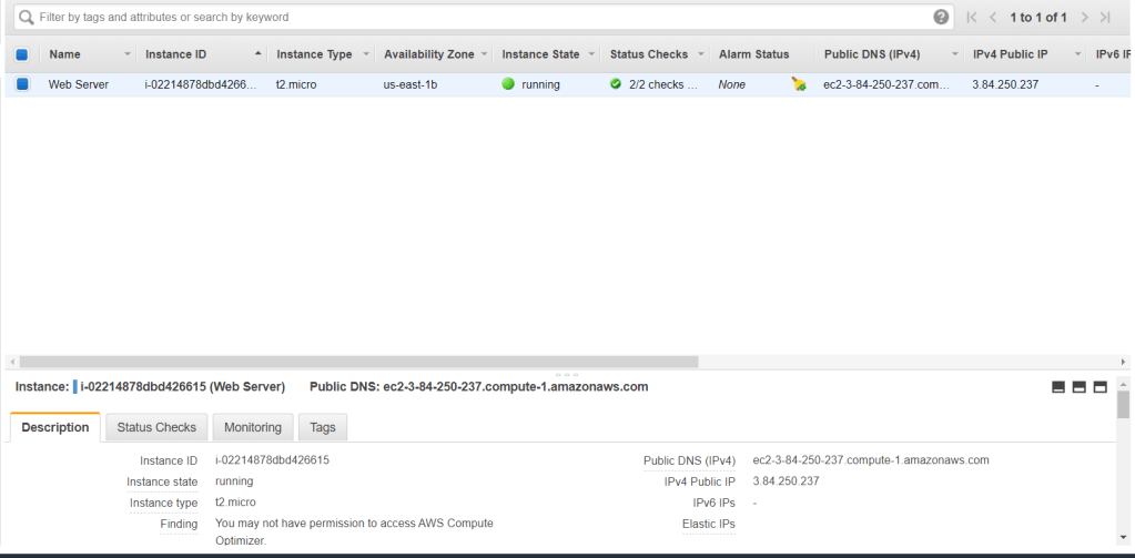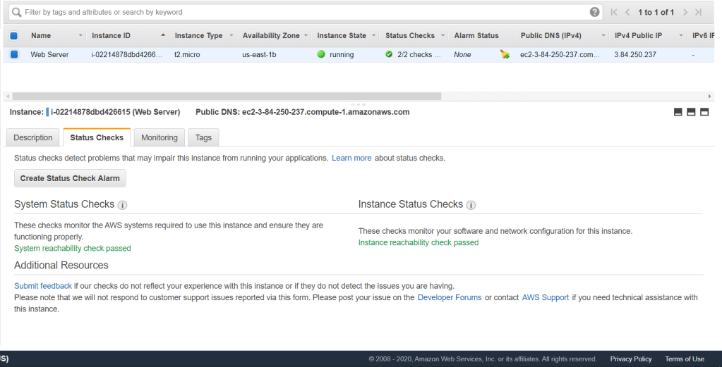 In the Instances menu, you will now see the instance is running/initializing. It will take a while until the instance fully runs. Make sure the Status Checks shows 2/2 checks passed. You can also check the Public DNS for this instance under the Description tab.