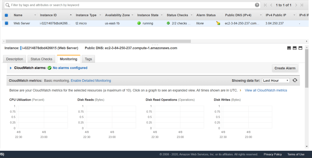 Now go to the Monitoring tab. Currently you will not see any/much activity on the instance metrics as it is just recently launched and no data had been recorded yet. By default it records in 5 minutes interval which is maintained by AWS CloudWatch.