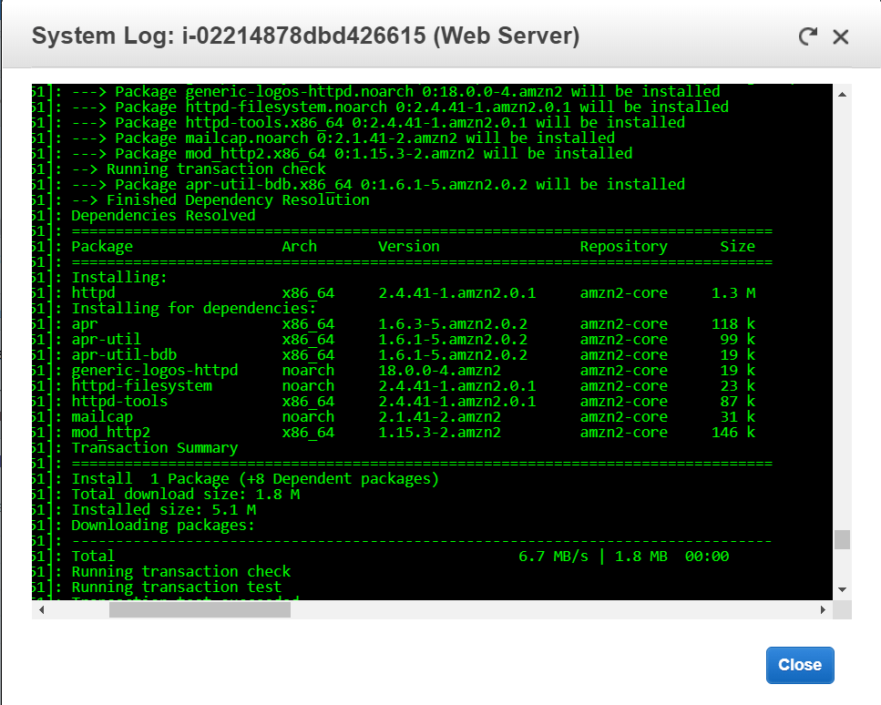 Scroll down and try to find a log that states the installation of httpd. As you have remembered, we provided the script to install an Apache web server which we can see here executing from the system log.