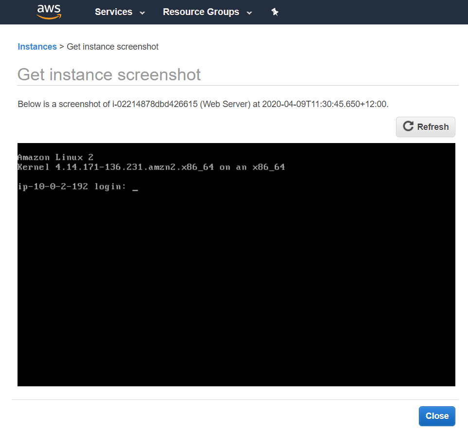 Next, you can get a screenshot of your instance by going under Actions > Instance Settings > Get Instance Screenshot. This is helpful in case you cannot reach your instance by SSH, you can check the condition of your instance from a screenshot.