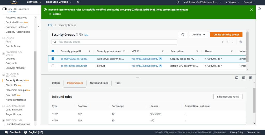 To correct this, we need to allow an inbound HTTP connection through the security groups rules. Go to Security Groups menu on the left side and click on Web server security group. Click on the Inbound rules tab and Edit inbound rules. Add a rule with Type = HTTP and Source = Anywhere. With this rule applied, all HTTP connection will be allowed through the instance.