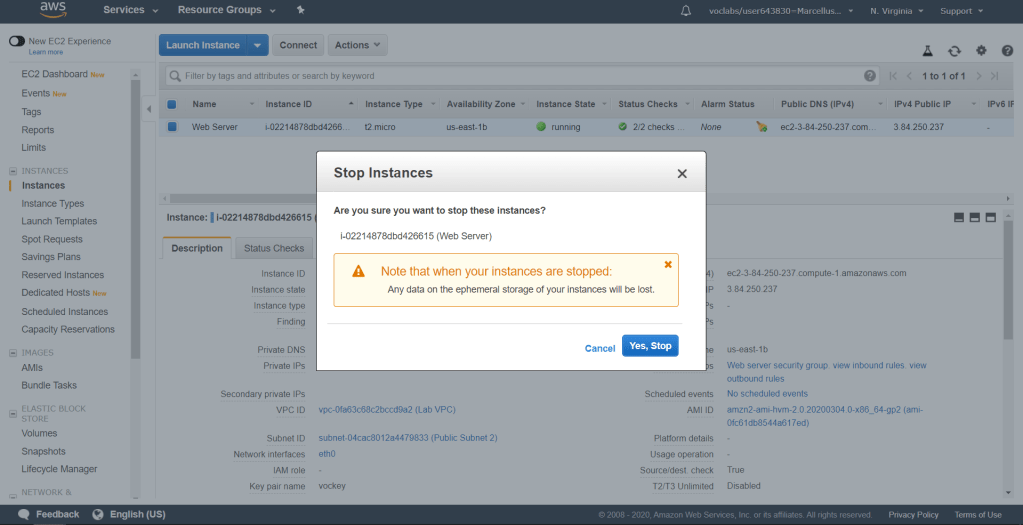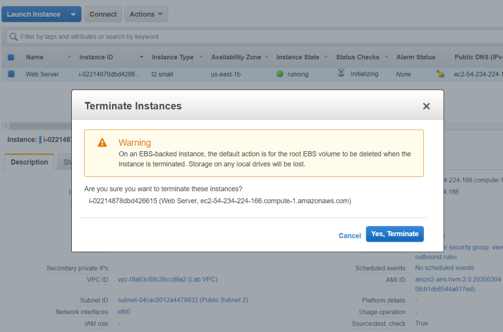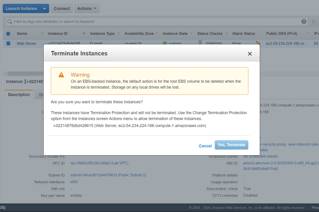 If we now try to terminate the instance, the Yes, Terminate button is accessible and the instance is able to be terminated.