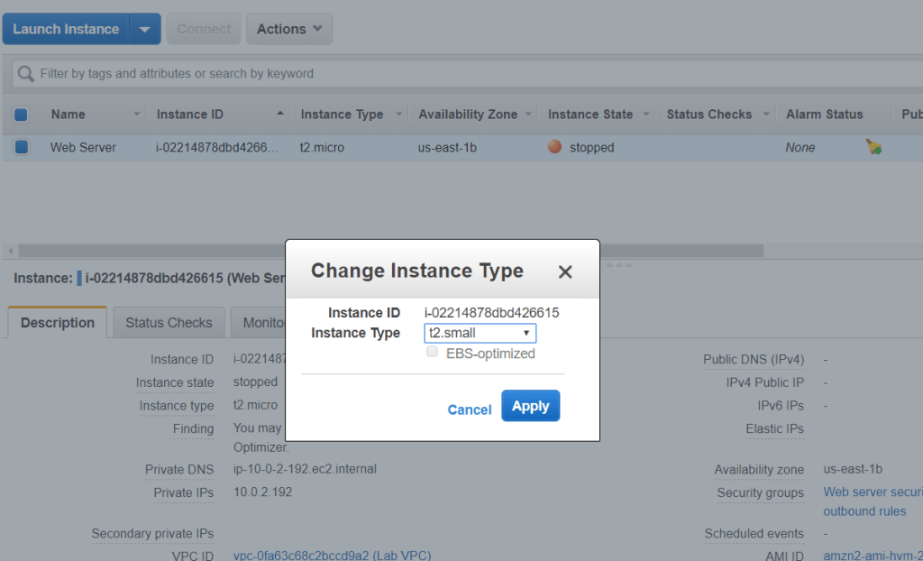 To change the instance type, go to Actions > Instance Settings > Change Instance Type. Change it to t2.small which has larger memory than t2.micro and click Apply.