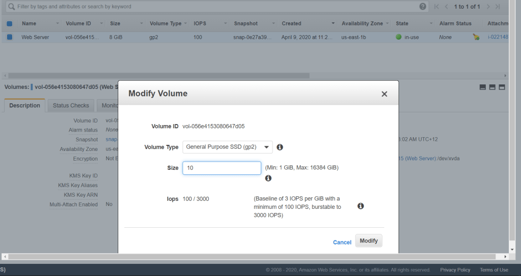 Click on the particular instance and go to Actions >Modify Volume. In this case, we will increase the size to 10 GB. Click Modify to apply.