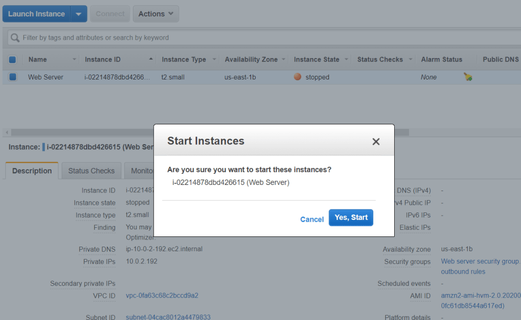To finish this section, go back to Instances and start the instance by going to Actions > Instance State > Start.