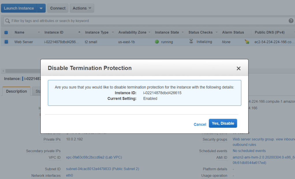 We had set the instance we launched with termination protection. Now to test it, go to the Instance and select Actions > Instance State > Terminate. You will get a Terminate Instance warning but the accept button is inaccessible. This proves that the termination protection works.